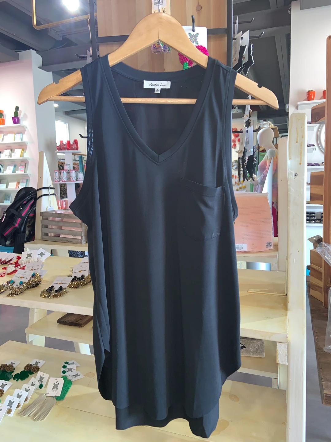 A sleeveless curved raw hem, with front pocket v-neck.Â