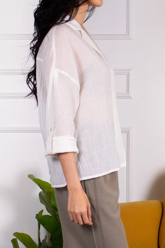Soft, Sheer Voile Fabric. Poly/Cotton Blend. Relaxed Fit. Front Pocket. Notched Collar. Convertible Sleeves. Sheer Cotton Voile Collared Top With Wide, Convertible Sleeves.