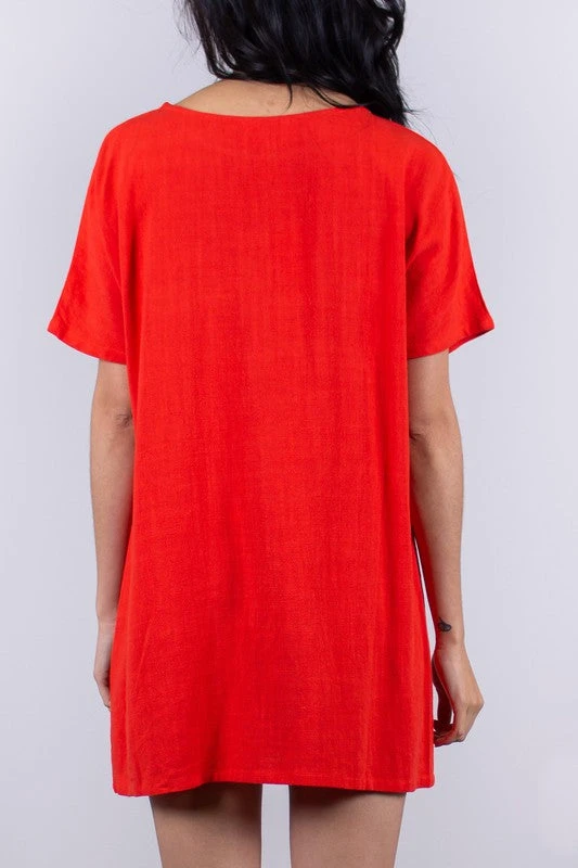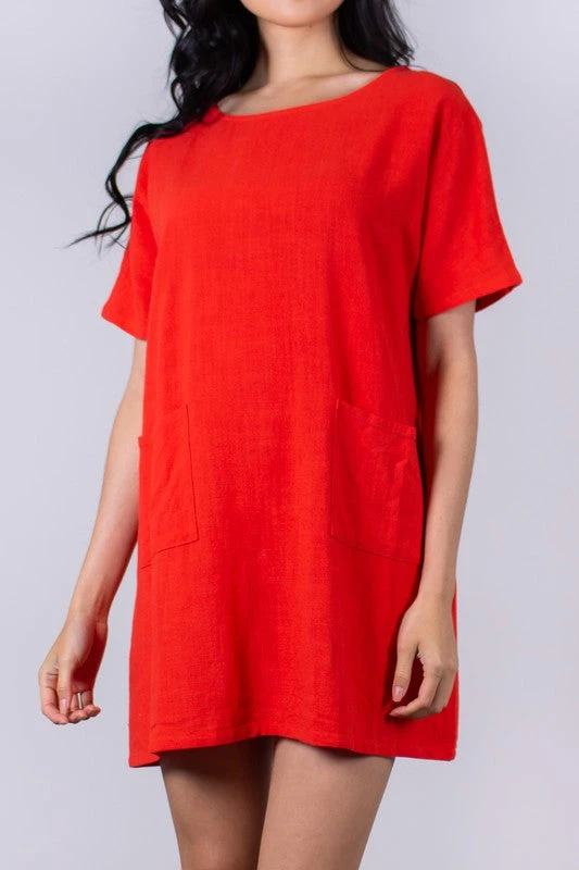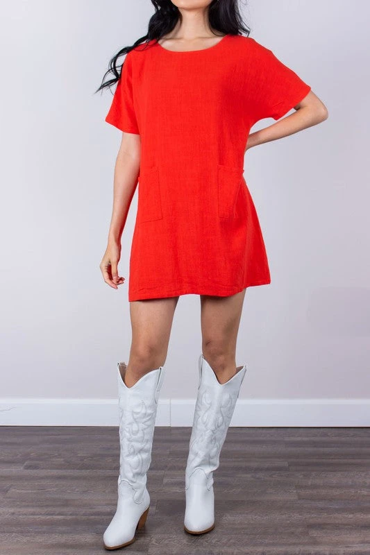 Short Sleeve Mini Linen Dress With Front Pockets.