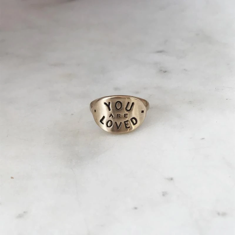 Wear the You Are Loved Ring on days that you might feel lonely… But just know, YOU ARE LOVED. The petite ring is hand-stamped and cast in bronze.Â