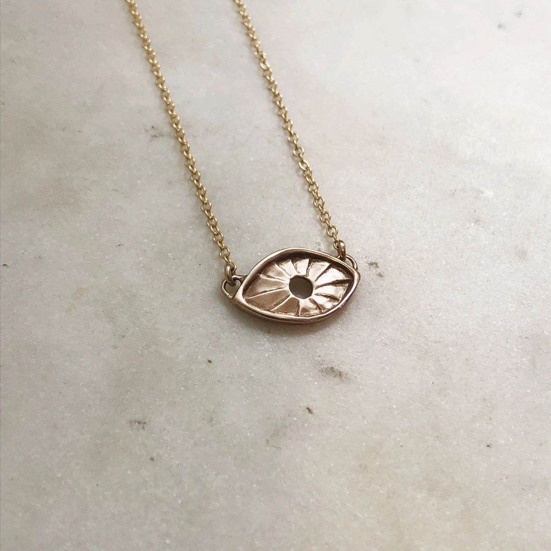 Wear the Eye Necklace as a reminder to look for the positives in any situation.This dainty necklace is perfect for wearing by itself or layering! Comes on 18″ Chain.Â