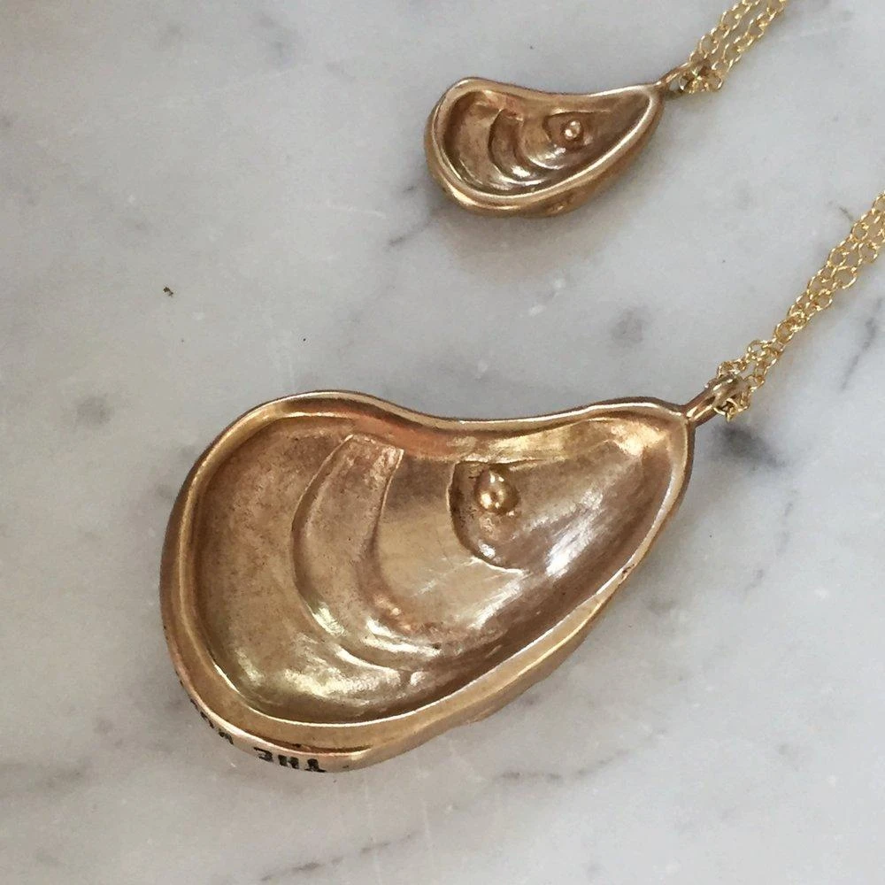 This hand carved oyster has the words “the world is your” on its bottom edge* and a small pearl detail” on its inside. *The small oyster pendant includes no carved text.