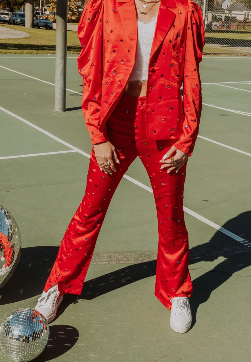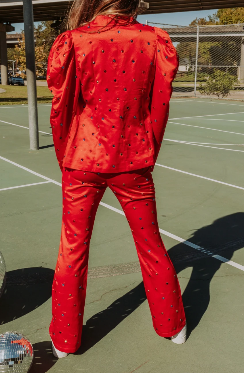 - Shop the matching blazer! https://wanderlustbyabby.com/collections/new/products/queen-of-sparkles-red-poof-sleeve-rhinestone-blazerÂ