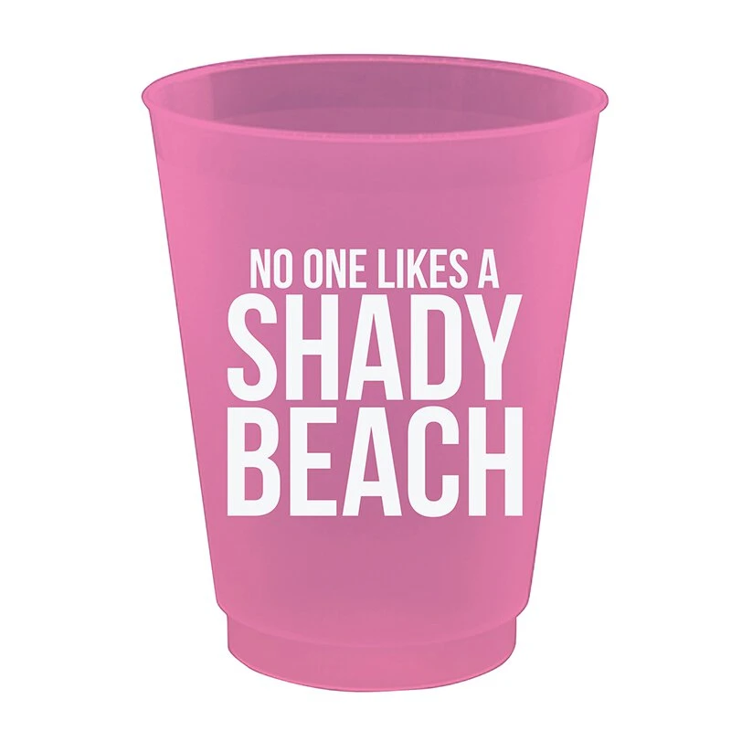 - Pink Cups With “No One Likes A Shady Beach” In White Lettering