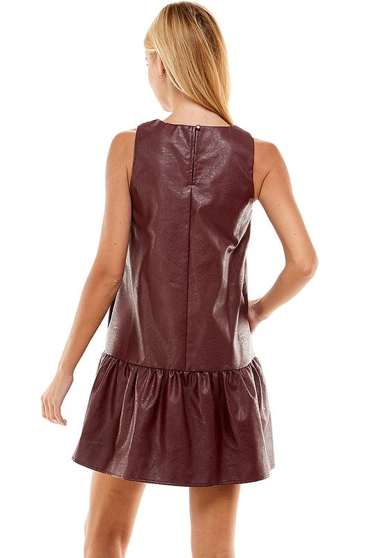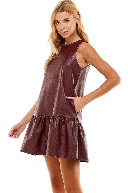 Faux leather dress featuring dropped waist, hidden pockets at side seam, ruffle hem and back keyhole with button closures.