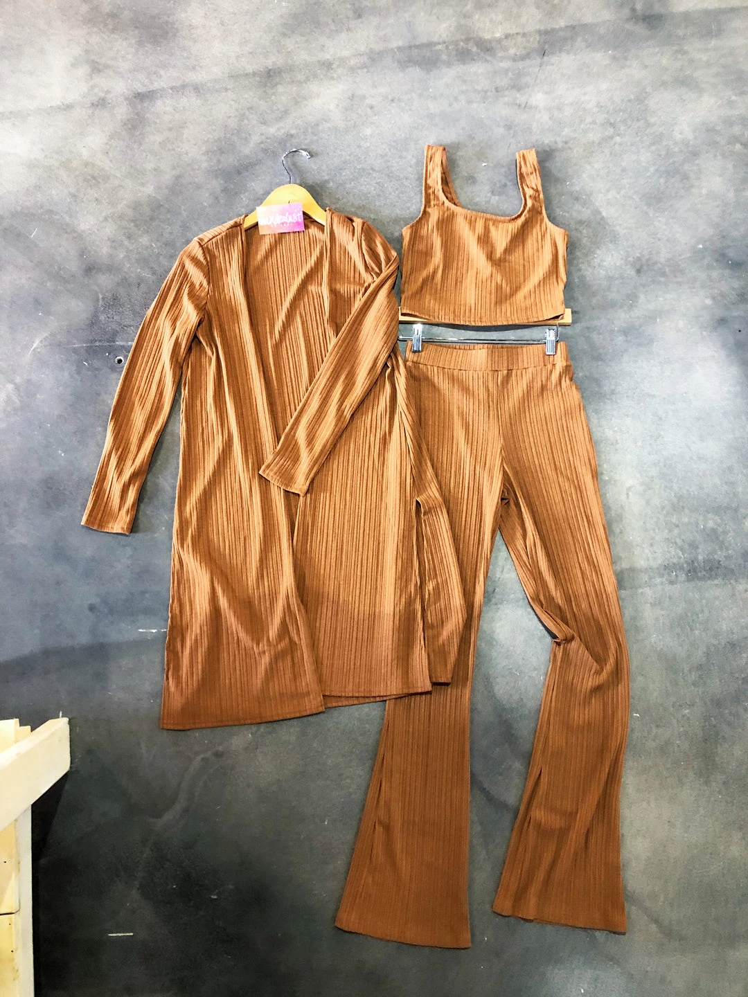3 Piece Ribbed Top, Midi Cardigan, And Flowy Pant SetÂ