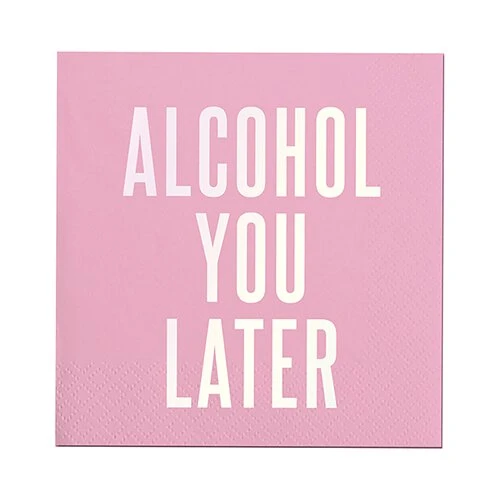 - Light pink napkin with “Alcohol You Later” in white lettering