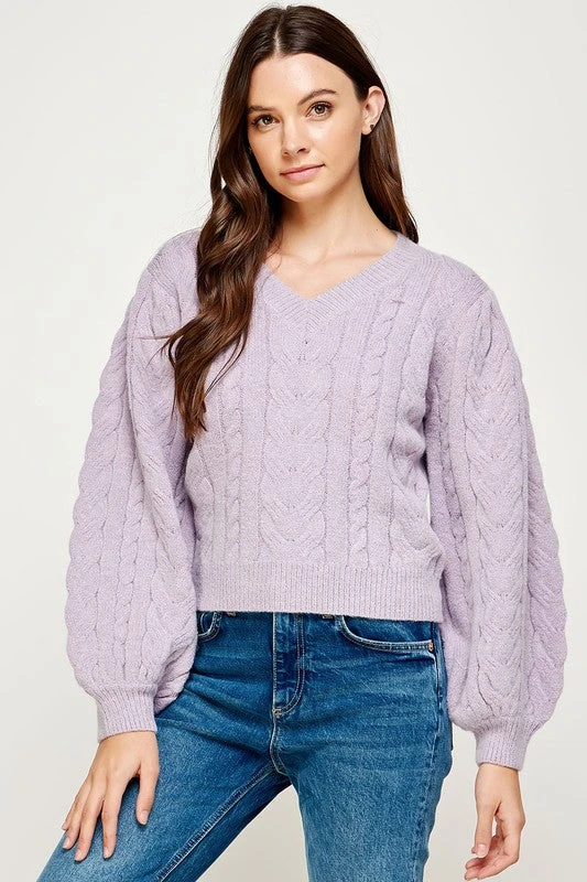 Cable knit puff long sleeve sweater. This style features a classic V neck, long puff sleeves, and rib detail at neck/cuff/hem