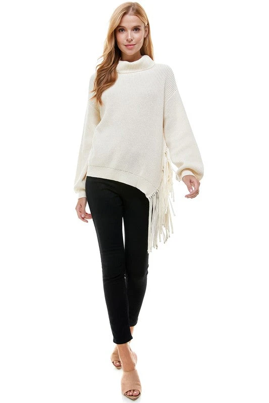 A slightly oversized turtleneck sweater with asymmetric fringe and voluminous sleeves.
