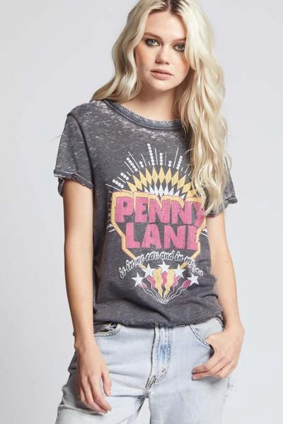Take a trip down “Penny Lane” in this one of a kind vintage inspired John Lennon and Paul McCartney lyric tee. Designed with lyrics from the 1967 song, “Penny Lane”, the shirt reads, “Penny Lane is in my ears and in my eyes”. Made with soft vintage washed fabric, a ribbed crew neck, distressed hems, cuffed sleeves, and a fitted silhouette.