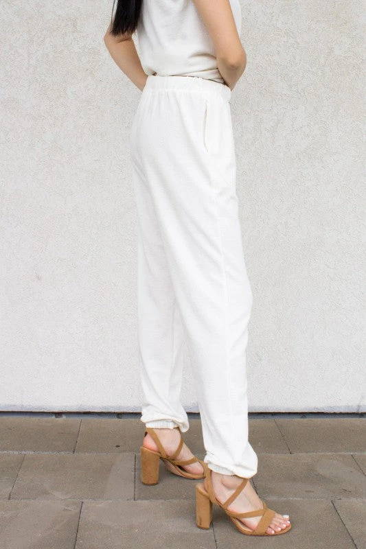 Stretchy Knit Crepe Hacci. Elastic Waistband. High Rise. Elasticized Ankle Cinching. Side Pockets.