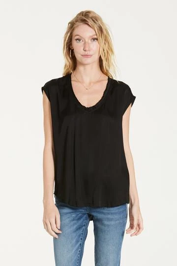 Silky sheen v-neck top finished sleeveless. Solid color woven on relaxed fit, styled with center back seam.