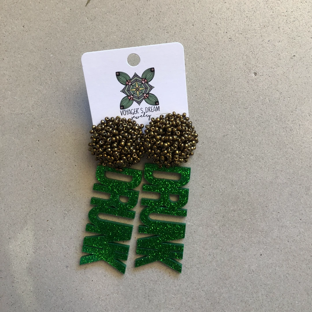 Acrylic ‘Drunk’ earrings with a gold beaded stud.