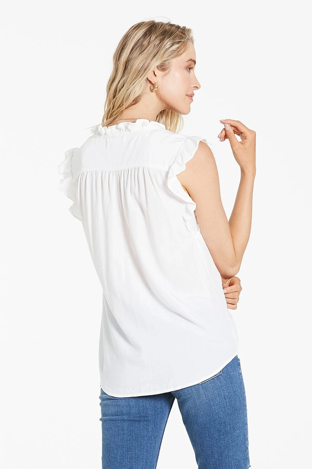 Shirred front & back panel, button front shirt finished sleeveless with ruffles at neck & armhole, curved hem. Solid color woven on relaxed fit, styled with clear buttons.