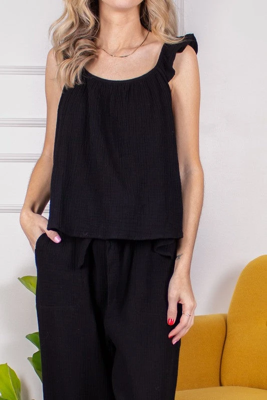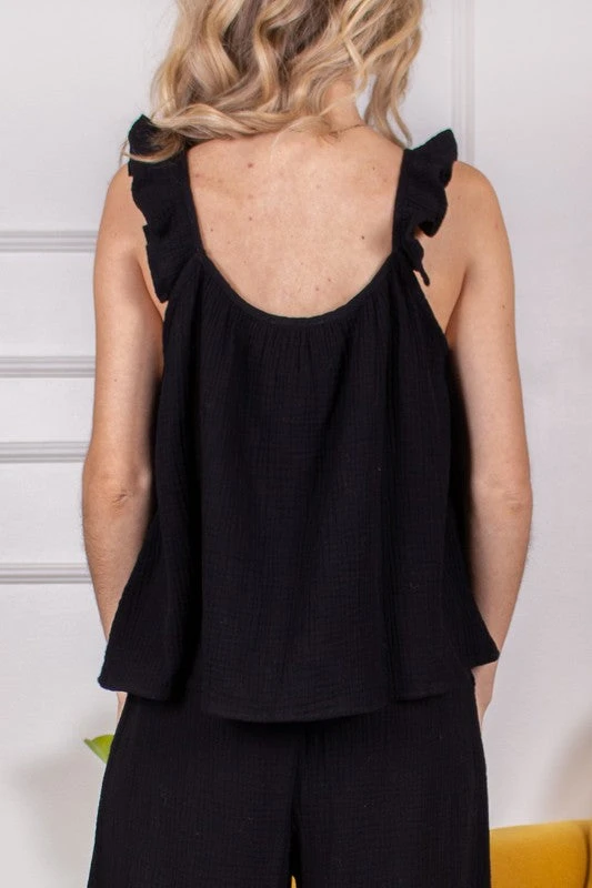 Gauze tank top with ruffle straps.