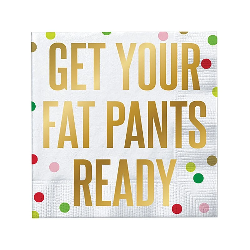 - White napkin with multi colored dots and “Get Your Fat Pants Ready” in gold lettering