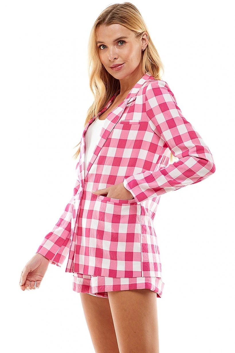 Classic double breasted blazer, features front button, collared design, front pockets, and gingham pattern.