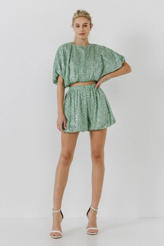 Green Sequin Cropped Puff Top