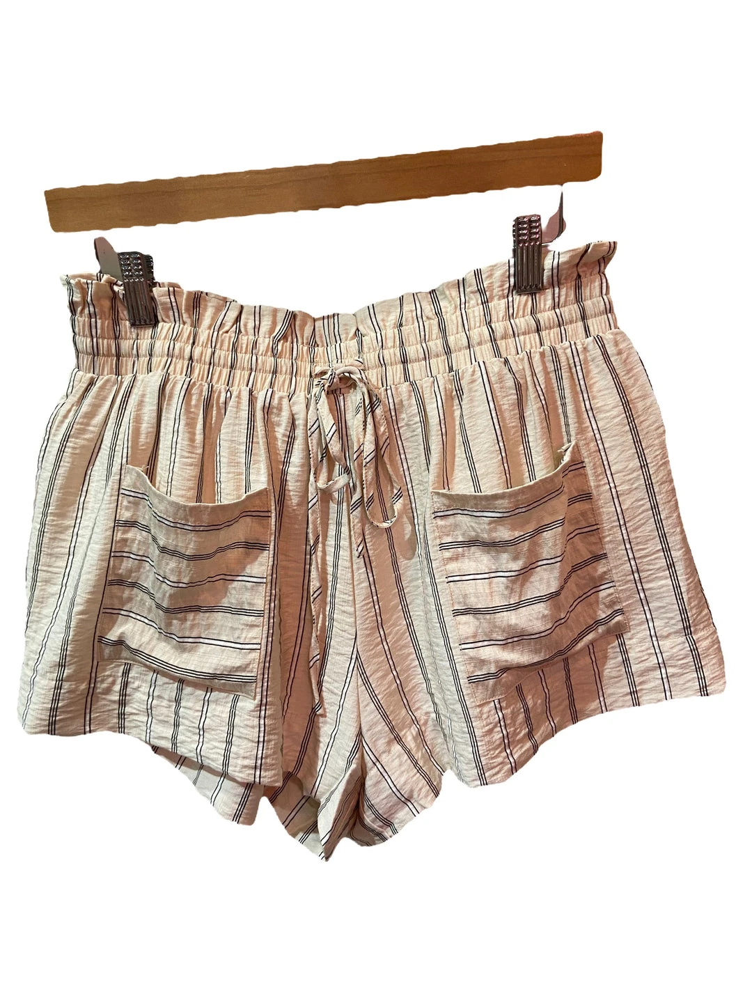 High waist paper bag style shorts, with slouchy design and double front pockets. Smocked waistband for comfortable fit, along with front tie.