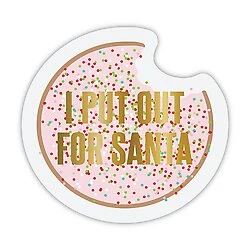 - Pink cookie shaped napkin in pink and confetti with phrase “I Put Out for Santa”