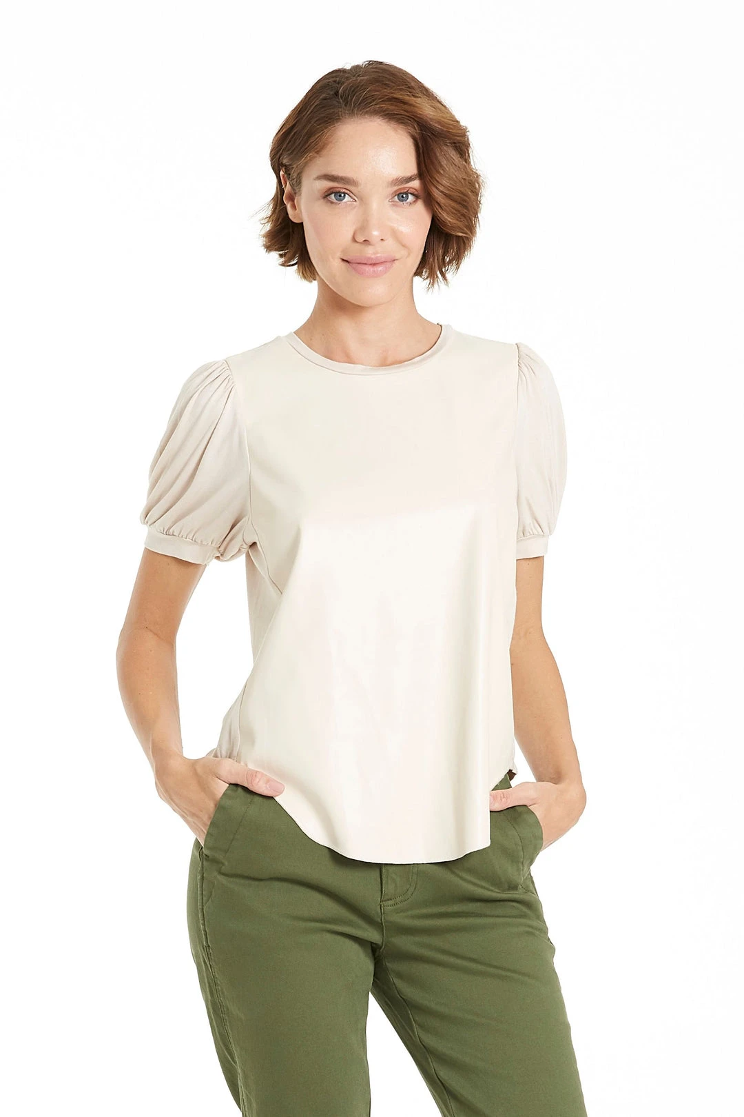 Pleather front top with ruffle sleeves.