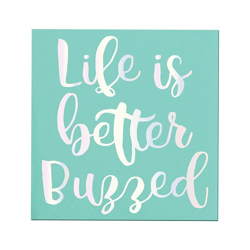 - Blue napkin with “Life Is Better Buzzed” in white lettering