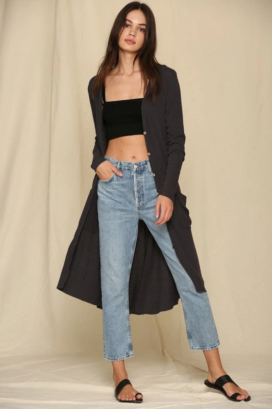 Details: long sleeve, knit, ribbed, button down, long cardigan