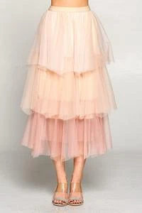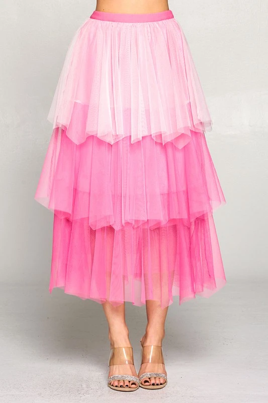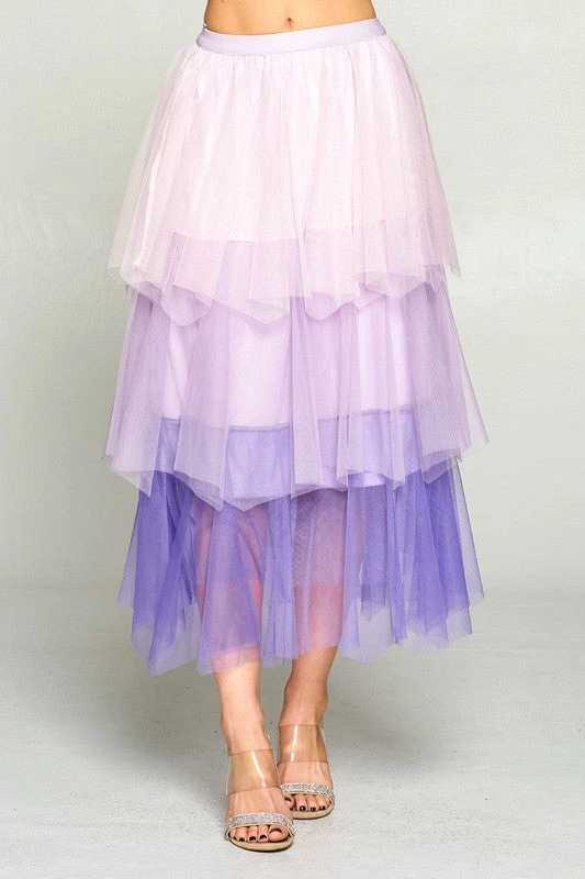 Mesh Layer Midi Skirt. This Style Features Triple Ombre Tiers, Knit Lining, And Elastic Band.