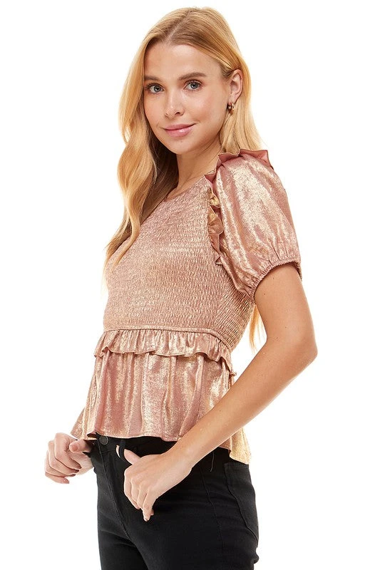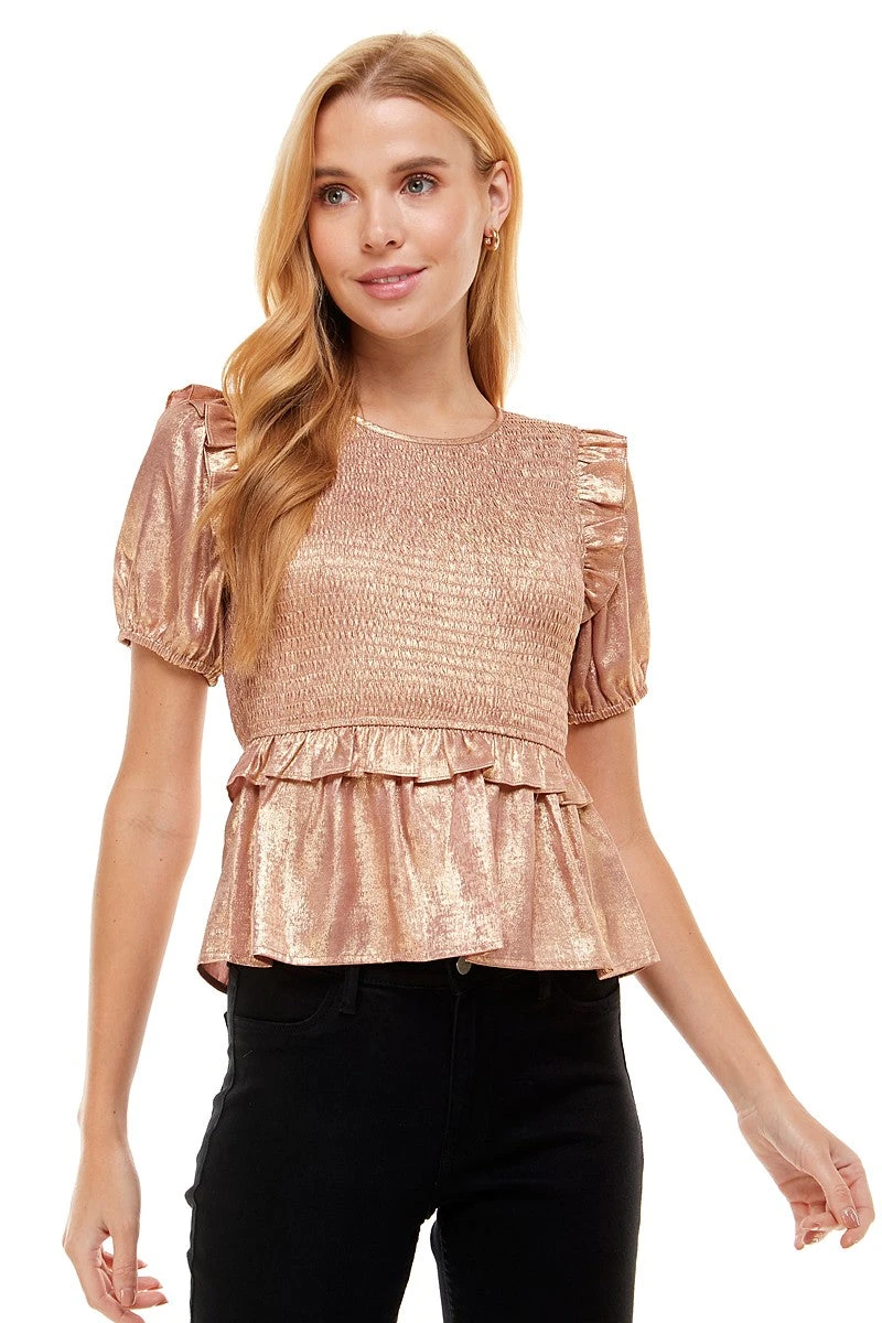 Metallic top featuring a high neckline, short bubble sleeves, ruffle detail, and a peplum style bottom.