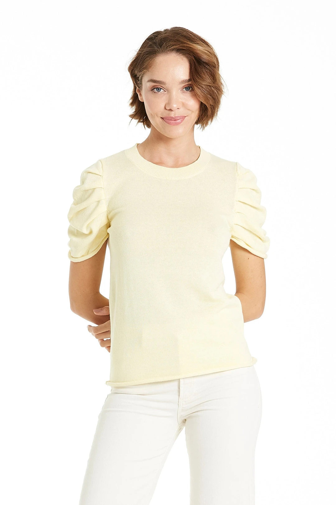 - Short Sleeve Crew Neck with Sleeve Pleat Repeats