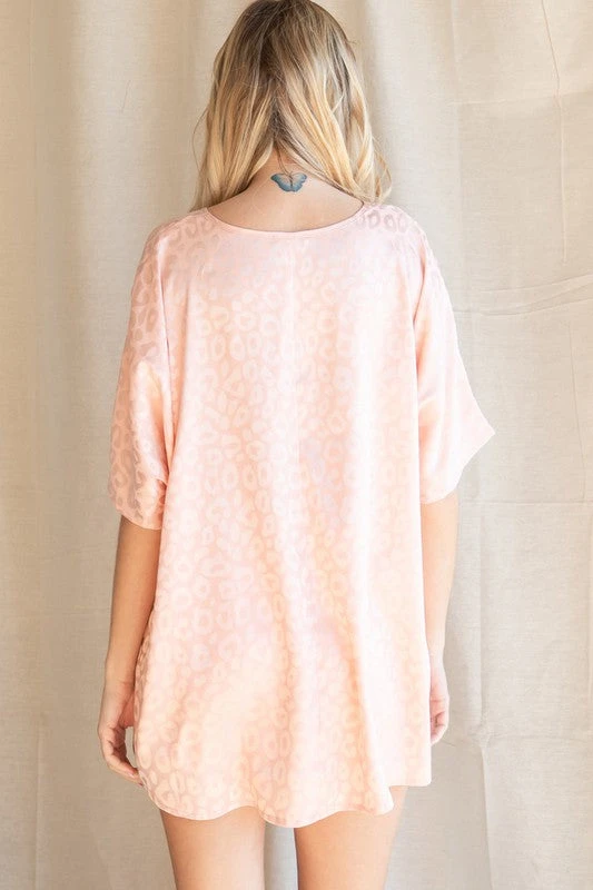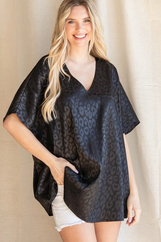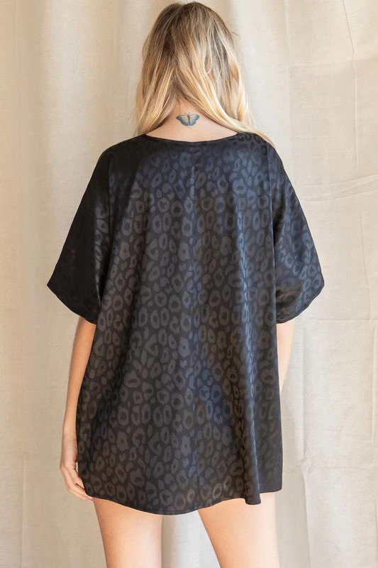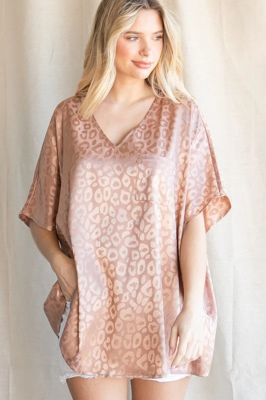 Satin Leopard Print Oversized Top With A V-Neckline, Short Dolman Sleeves, And A Left Chest PocketÂ