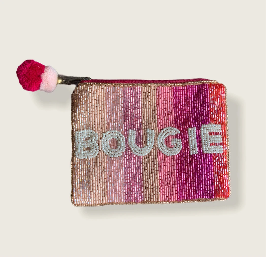 Beaded pink “Bougie” coin purse with pom-pom zipper.