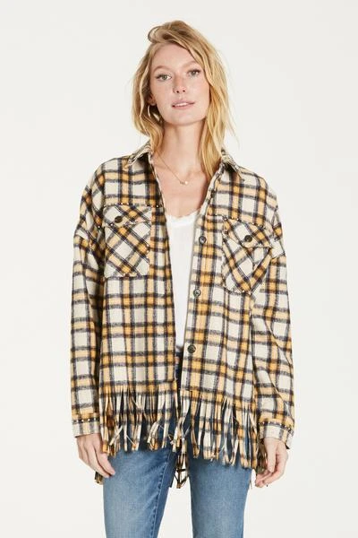 Fringed hem, button front, long sleeve jacket finished with self blocked flap pockets. Multi pattern plaid on relaxed fit, styled with metallic studs at pockets, cuffs, back yoke, collar.