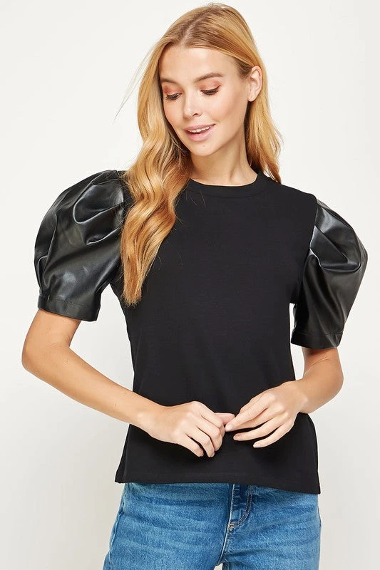 Faux leather sleeve t-shirt top. This style features trendy balloon pleated short sleeves, and knit body.