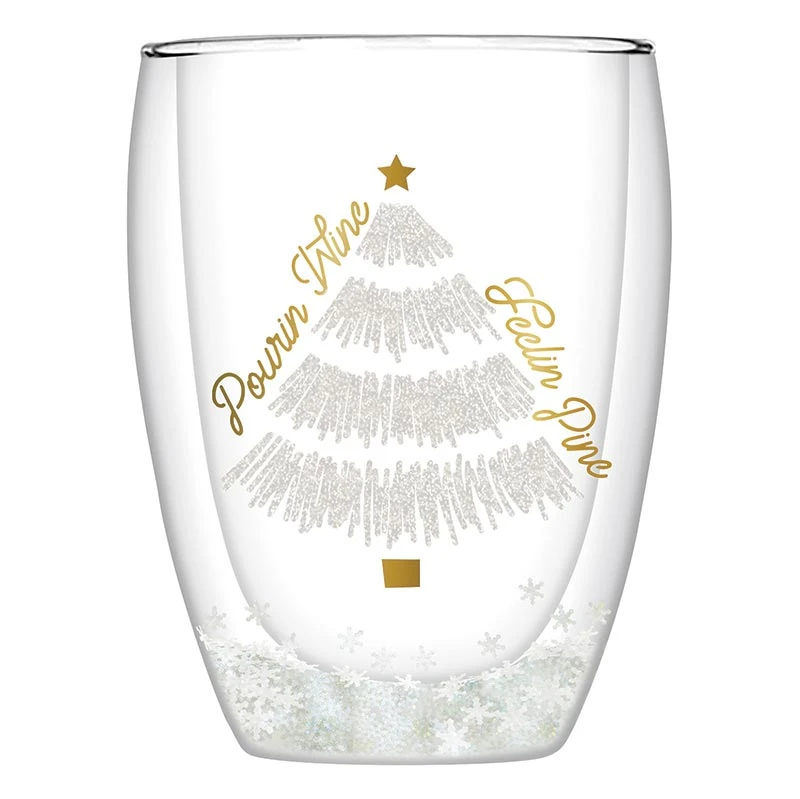 Sip your favorite holiday beverages in style with this double wall stemless glass! Snowflake confetti inside to double wall adds a touch of whimsy to each glass