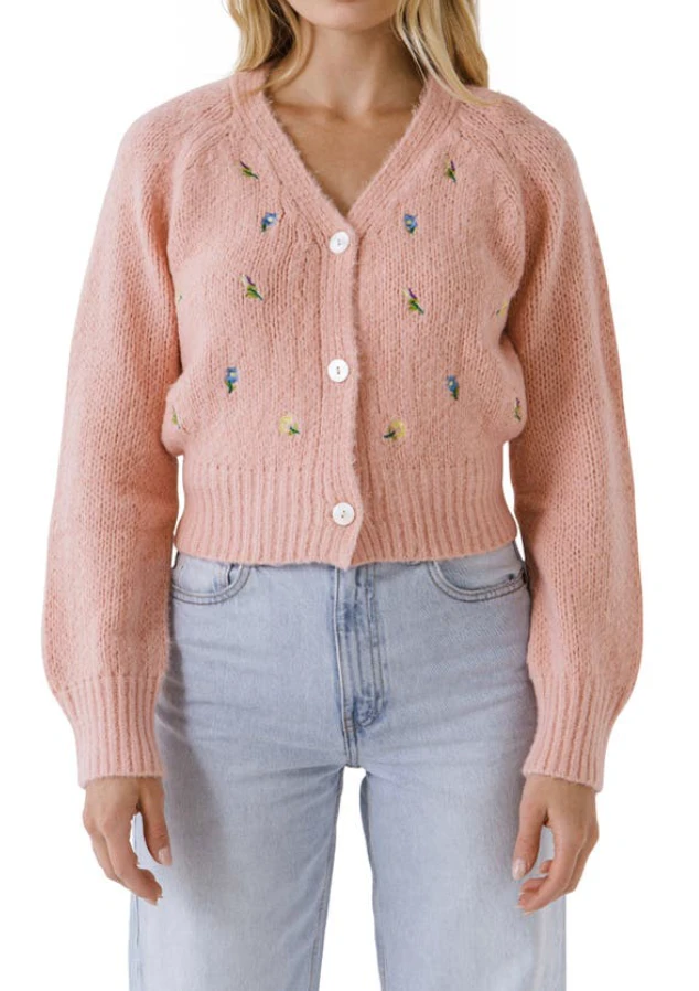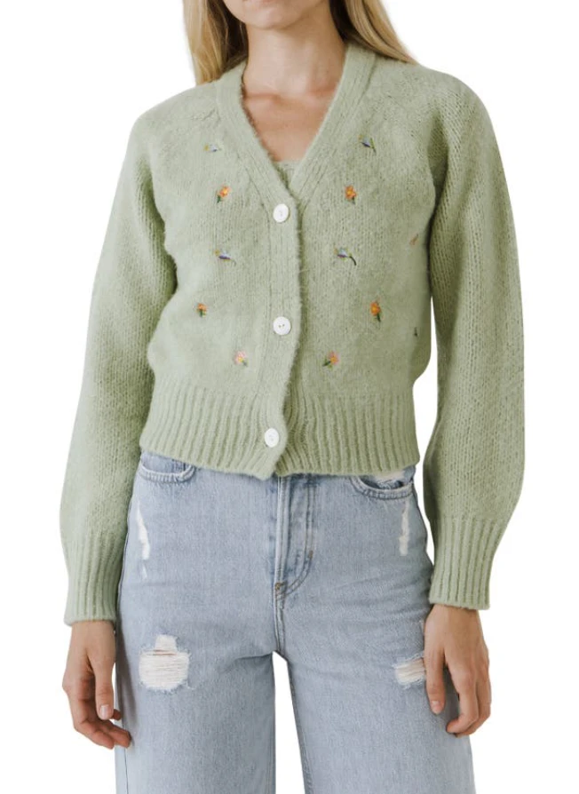 - With winsome florals and blousy sleeves, this V-neck cardigan is sweetly whimsical and perfect for cool-weather layering