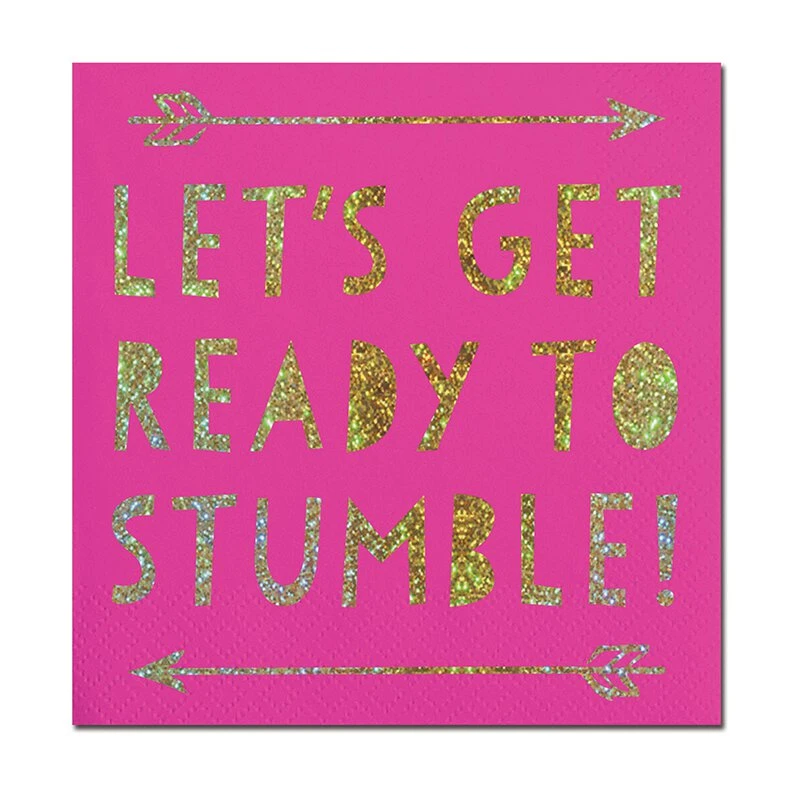 - Hot pink napkin with “Let’s Get Ready to Stumble!” in sparkle gold lettering