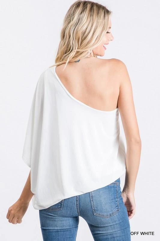 Off-the-shoulder flowy top with an elastic band waist in the interior lining.