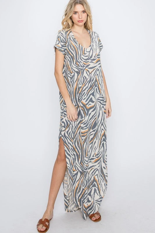 Zebra Print Maxi Dress With Side Slit And Round Hem