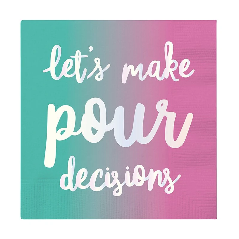 - Pink and blue napkin with “Let’s Make Pour Decisions” in white lettering