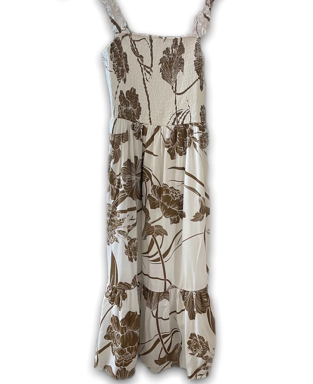 Ruched flower patterned sleeveless midi dress with ruffle straps.
