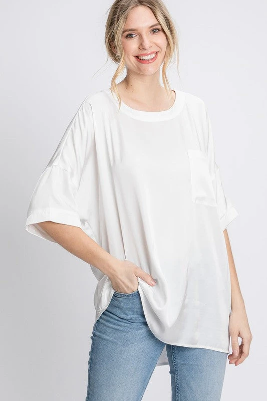 Solid satin top with dropped shoulders, wide half sleeves, and a chest pocket.