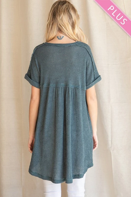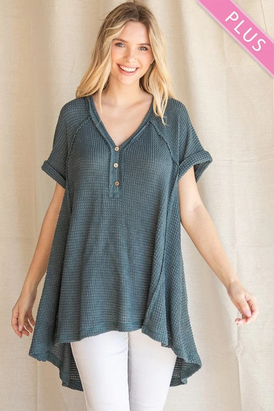 Plus Size solid waffle knit top with a button v-neckline, short cuffed sleeves, and a hi-low hemline.Â