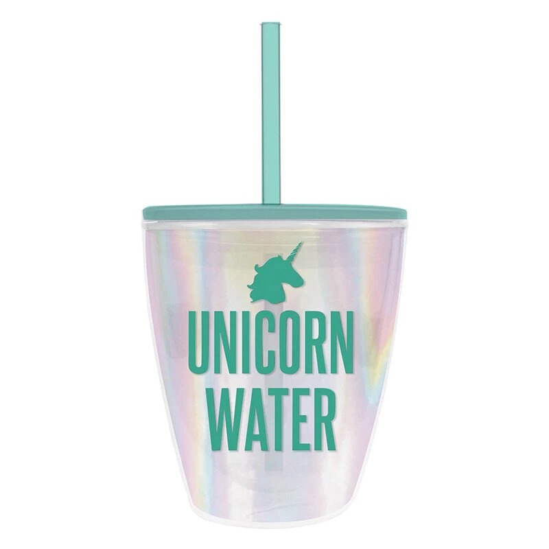 - Shiny exterior with “Unicorn Water” in blue lettering