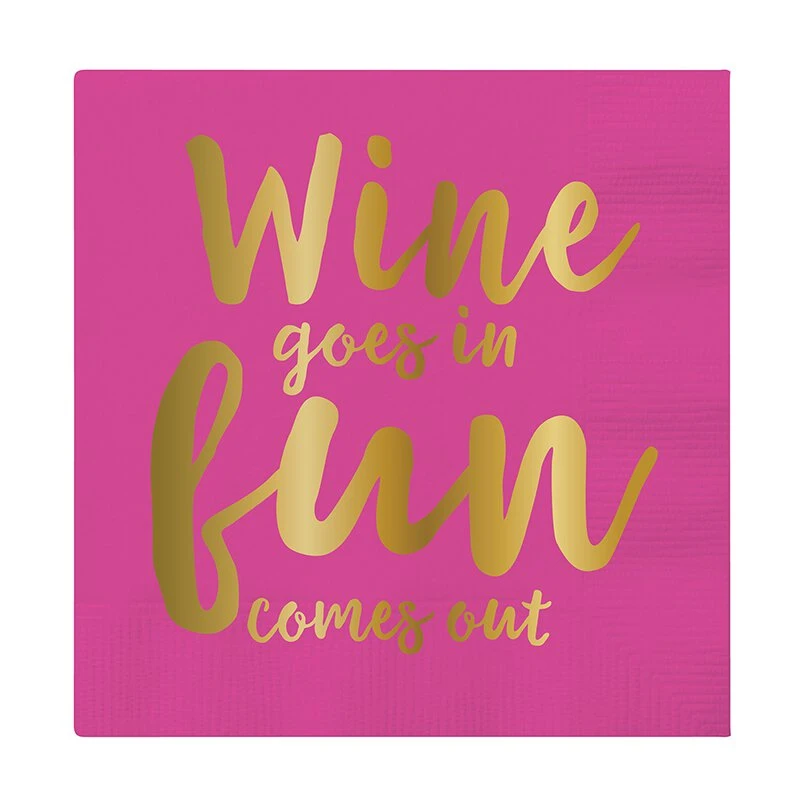 - Pink napkin with “Wine Goes In, Fun Comes Out” in gold lettering