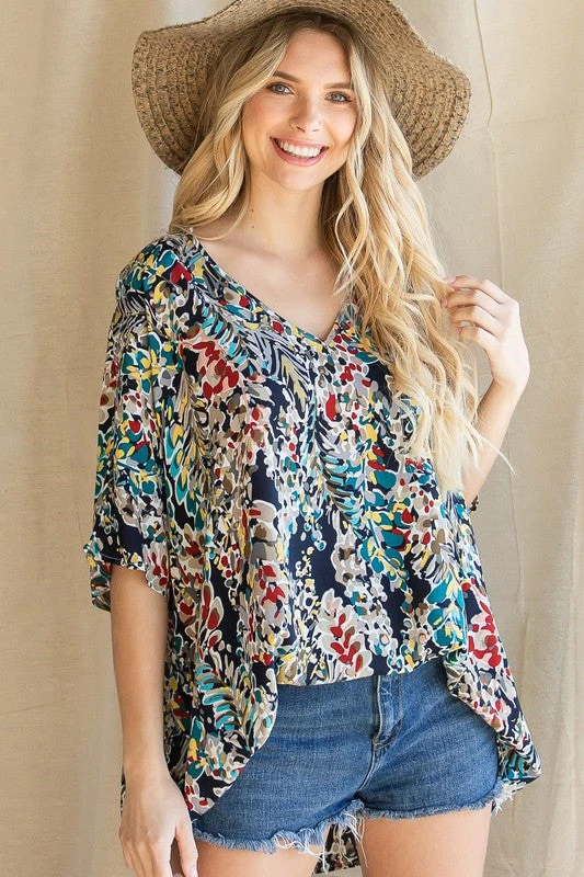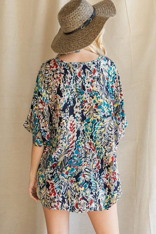 Watercolor Print Oversized Boxy Top With A V-Neckline, Short Dolman Sleeves, And A Chest Pocket. Unlined, Non-Sheer, Lightweight.