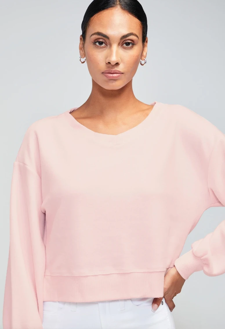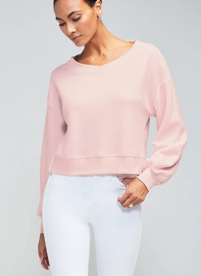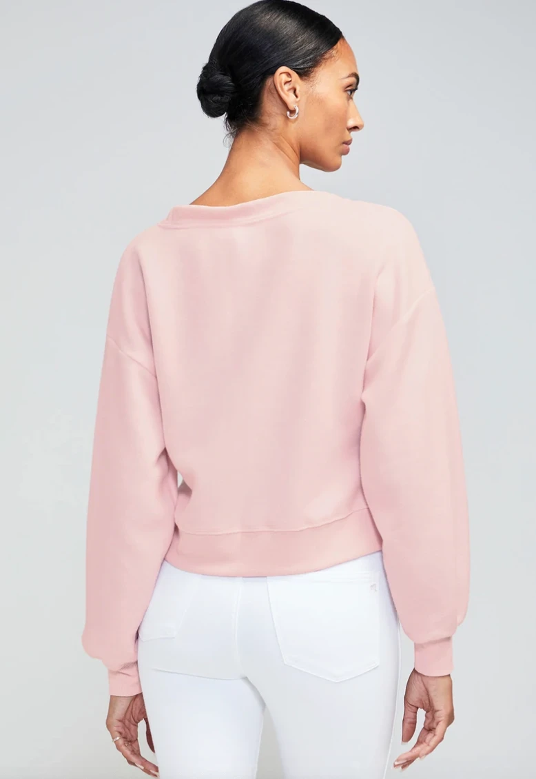 - The Pale Pink V-Neck is an oversized pullover with dropped shoulders, balloon sleeves, and banded trim.