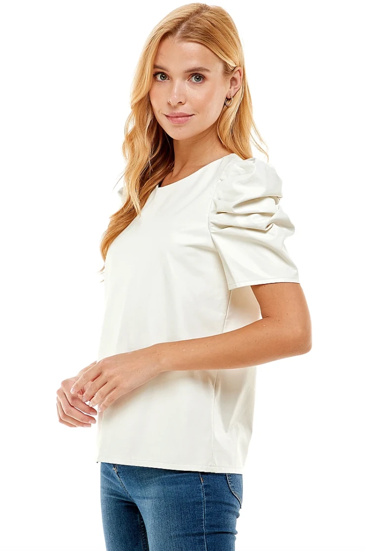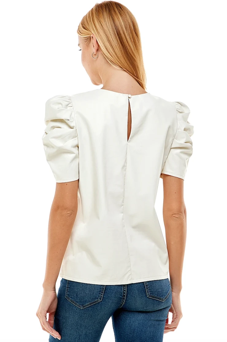 - A sophisticated pearl cream faux leather blouse featuring pleated puff sleeves and button closure in the back!Â