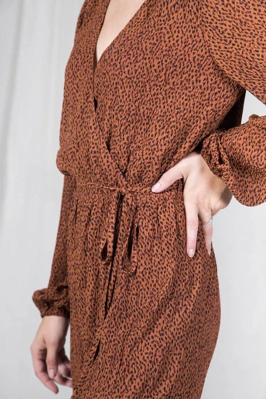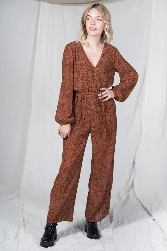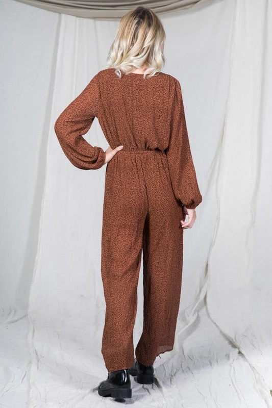 A WOVEN JUMPSUIT FEATURING AN ALLOVER POLKA DOT PRINT,WITH LONG SLEEVES,DRAWSTRING WAIST, AND A WIDE LEG.