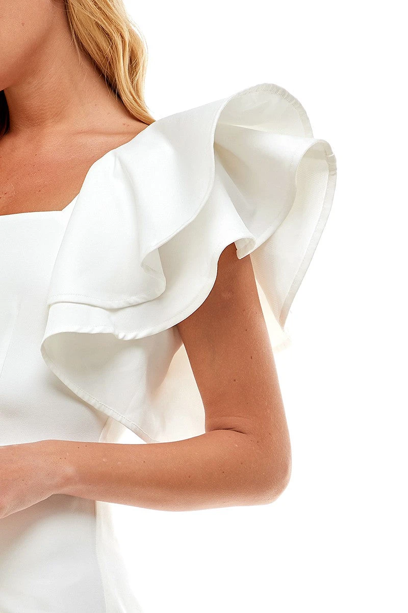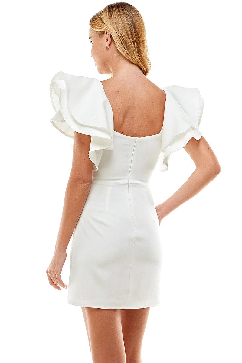 Thigh length dress featuring a square neckline, high waist, and loose ruffle sleeves. Square back and hidden zipper.